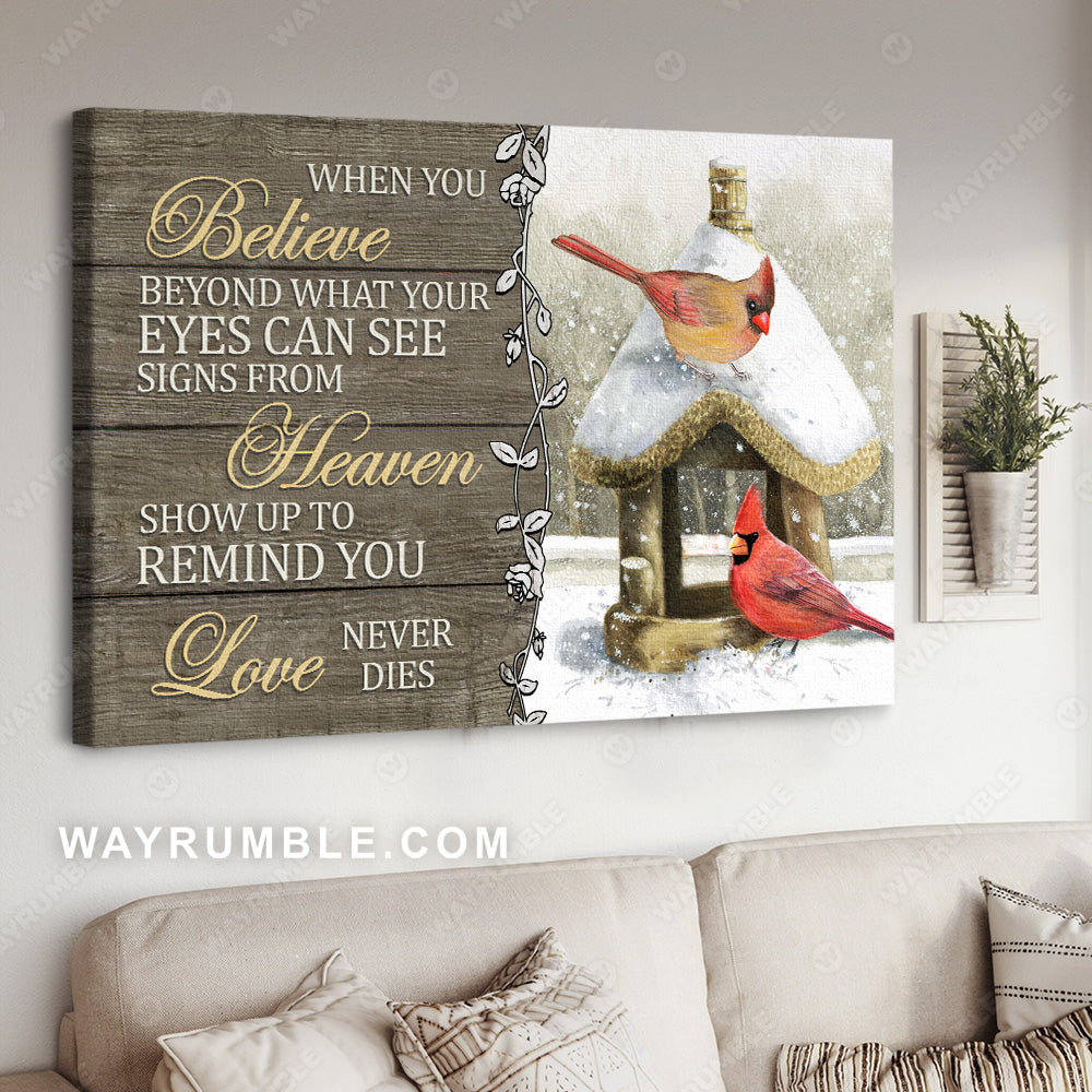 Pretty birdhouse, Cardinal drawing, Snow painting, Signs from heaven show up to remind you love never dies - Heaven Landscape Canvas Prints, Wall Art