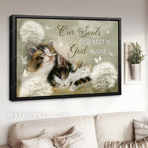 With beautiful dandelion flower, cute calico cat painting and inspiring quote, this wall art will make your house full of cheerfulness. Calico cat drawing, White dandelion, Butterfly, Our souls find rest in God alone - Jesus Landscape Canvas Prints, Christian Wall Art is also the perfect gift for your friends, your lover and even your family. This is a wonderful canvas that can be hung in any room in your house such as the living room, bedroom, kitchen or even outdoor space.