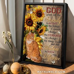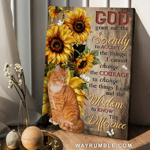 Tabby cat, Big sunflower, Wood background, God grant me the serenity - Jesus Portrait Canvas Prints, Christian Wall Art will suit any room in your house from the living room, bedroom and kitchen to the entryway.
