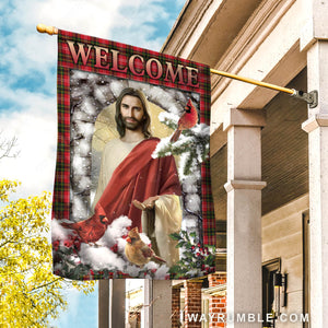 Jesus painting, Cardinal couple, Heavy snow, Cranberry tree, Welcome - Jesus Flag
