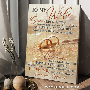 Do you want to find a romantic gift to express your love for your wife on her birthday or to celebrate your anniversary? Then To my wife, Wedding rings, On the sand, That's what they call happily ever after - Couple Portrait Canvas Prints, Wall Art will be an ideal choice for you!