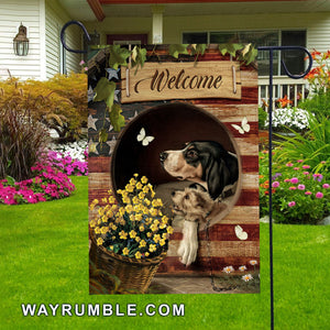 Black and tan coonhound, Pyrenean shepherd, Flower basket, Welcome - Dog Flag