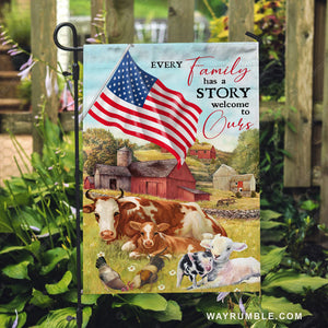 Green meadow land, Dairy cow, Beautiful US flag, Every family has a story welcome to ours - Family Flag
