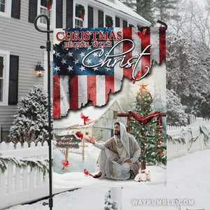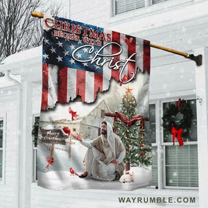 Walking with Jesus, Christmas painting, Red cardinal, Christmas begins with Christ - Jesus Flag