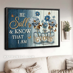 Blue flower painting, Glass vase, Monarch butterfly, Be still & know that I am God - Jesus Landscape Canvas Prints, Home Decor Wall Art