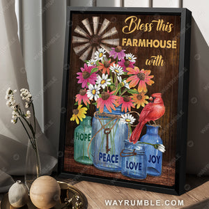 Cardinal, Flower Jars, Key, Bless This Farmhouse with Hope - Jesus Portrait Canvas Prints, Christian Wall Art