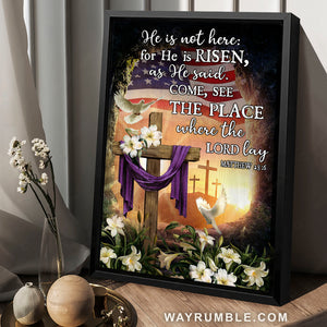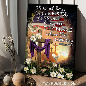 Cross symbol, US Flag, White dove, White lily, He is not here - Jesus Portrait Canvas Prints, Christian Wall Art