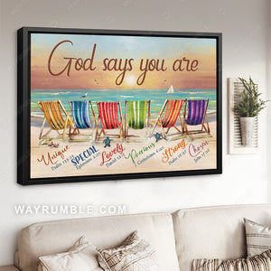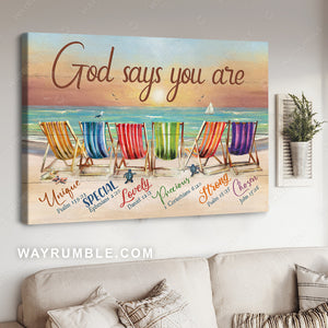 Summer vibe, Beautiful sunset, Colorful chair, God says you are unique - Jesus Landscape Canvas Prints, Christian Wall Art