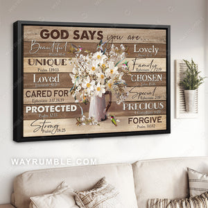 White flower painting, Still life, Vintage, God says you are - Jesus Landscape Canvas Prints, Wall Art is the perfect gift not only for your friend but also for your lover or even your family.