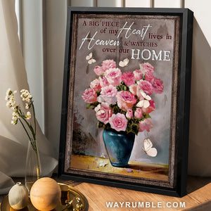 Brilliant pink rose vase, Still life painting, Butterfly, A big piece of my heart lives in heaven - Heaven Portrait Canvas Prints, Wall Art matches well with a variety of wall decor styles and rooms.