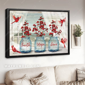Northern cardinal, Cranberry, Mason jar, Faith, Hope, Love, Window view - Heaven Landscape Canvas Prints, Wall Art
