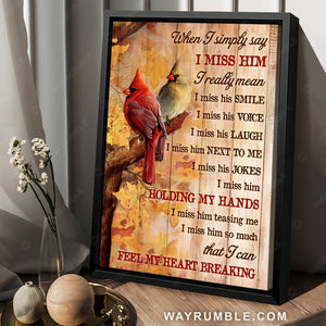 Express your emotions to your loved one who has gone with our Pretty cardinal, Yellow forest drawing, When I simply say I miss him - Heaven Portrait Canvas Prints, Wall Art. This artwork is a reminder for you that even though the person you loved is gone, your heart is still with them in heaven. The pretty cardinals in the yellow forest and a meaningful quote of our Pretty cardinal, Yellow forest drawing, When I simply say I miss him - Heaven Portrait Canvas Prints, Wall Art will bring the presence of the deceased to ease your nostalgia.