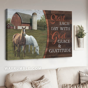 Green meadow land, Horses drawing, Start each day with God grace and gratitude - Jesus Landscape Canvas Prints, Christian Wall Art