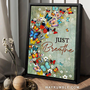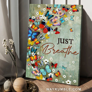 Which canvas do you choose to make your house become brighter? Colorful butterflies, Butterfly drawing, White flowers, Just breathe - Jesus Portrait Canvas Prints, Christian Wall Art is definitely the most suitable thing there. It depicts an incredible image of colorful butterflies and lovely white flowers with the meaningful, soothing-for-soul word that will make you feel refreshed and cheer you up.