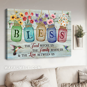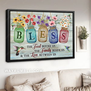 Glass jar, Colorful flower, Green hummingbirds, Bless food family love - Jesus Landscape Canvas Prints, Christian Wall Art