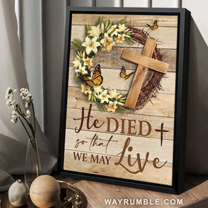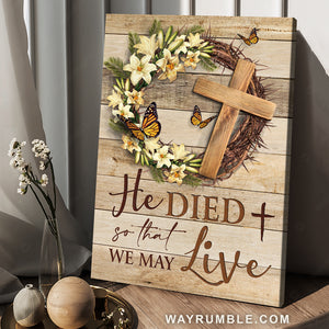 Gorgeous lily, Wooden cross, Lovely monarch butterfly, He died so that we may live - Jesus Portrait Canvas Prints, Christian Wall Art is a perfect gift for your friends, your lover and even your family, especially for those who are a religious Christian.