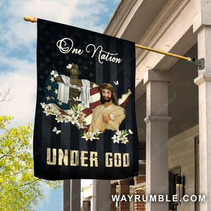 Lily flower garden, The face of Jesus, Wooden cross, One nation under God - Jesus Flag