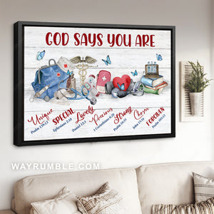 Nurses day, Red heart, Blue butterfly, God says you are unique - Jesus Landscape Canvas Prints, Christian Wall Art