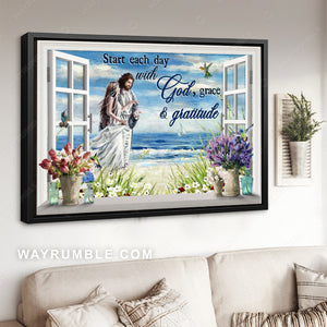 Pretty girl, Walking with Jesus, Blue ocean, Start each day with God - Jesus Landscape Canvas Prints, Christian Wall Art