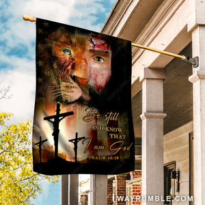 Stunning lion, Jesus on the cross, Cross symbol, Be still and know that I am God - Jesus Flag