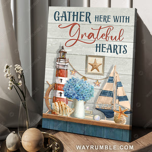 Beautiful lighthouse, Blue hydrangea, Beach symbol, Gather here with grateful hearts - Jesus Portrait Canvas Prints, Christian Wall Art will suits in any part of your home, including the living room, bedroom, kitchen, and even the outdoor space.