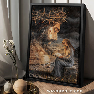 Across our canvas, it depicts an image of a beautiful girl reading a book and Jesus with a crown of thorn background. Its color scheme makes it a versatile piece in nearly any style of home. Our Reading girl, God know, Jesus painting, Crown of thorn - Jesus Portrait Canvas Prints, Christian Wall Art is wonderful artwork will suit any room in your house from the living room, bedroom and kitchen to the entryway.