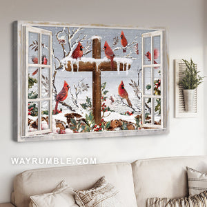 Amazing red cardinal, Wooden cross, Cranberry tree, Beautiful snowfall - Jesus Landscape Canvas Prints, Home Decor Wall Art