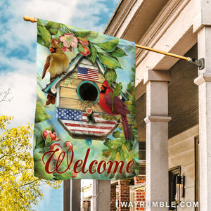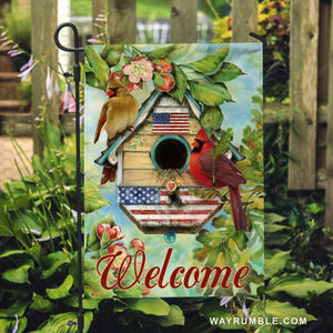 Beautiful cardinal, Colorful birdhouse, Red flower garden, Welcome - Family Flag