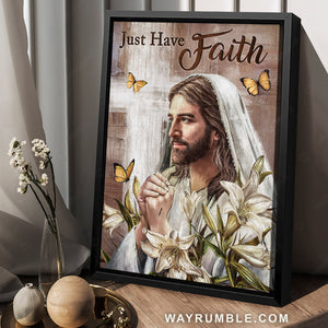 Our Beautiful Jesus painting, Monarch butterfly, Lily flower, Just have faith - Jesus Portrait Canvas Prints, Christian Wall Art will help you create a peaceful atmosphere in your home. This artwork features an image of Jesus surrounded by stunning lily flowers and lovely butterflies with meaningful, soothing-for-souls words that will become a highlight feature in your house. Additionally, the color combination makes it adaptable to almost any type of house decor. Beautiful Jesus painting, Monarch butterfly, Lily flower, Just have faith - Jesus Portrait Canvas Prints, Christian Wall Art can be displayed on the wall of your home's kitchen, living room, bedroom, bathroom, or outdoor space. They can also be hung on the walls of your office, building, hotel, restaurant, or even coffee shop.